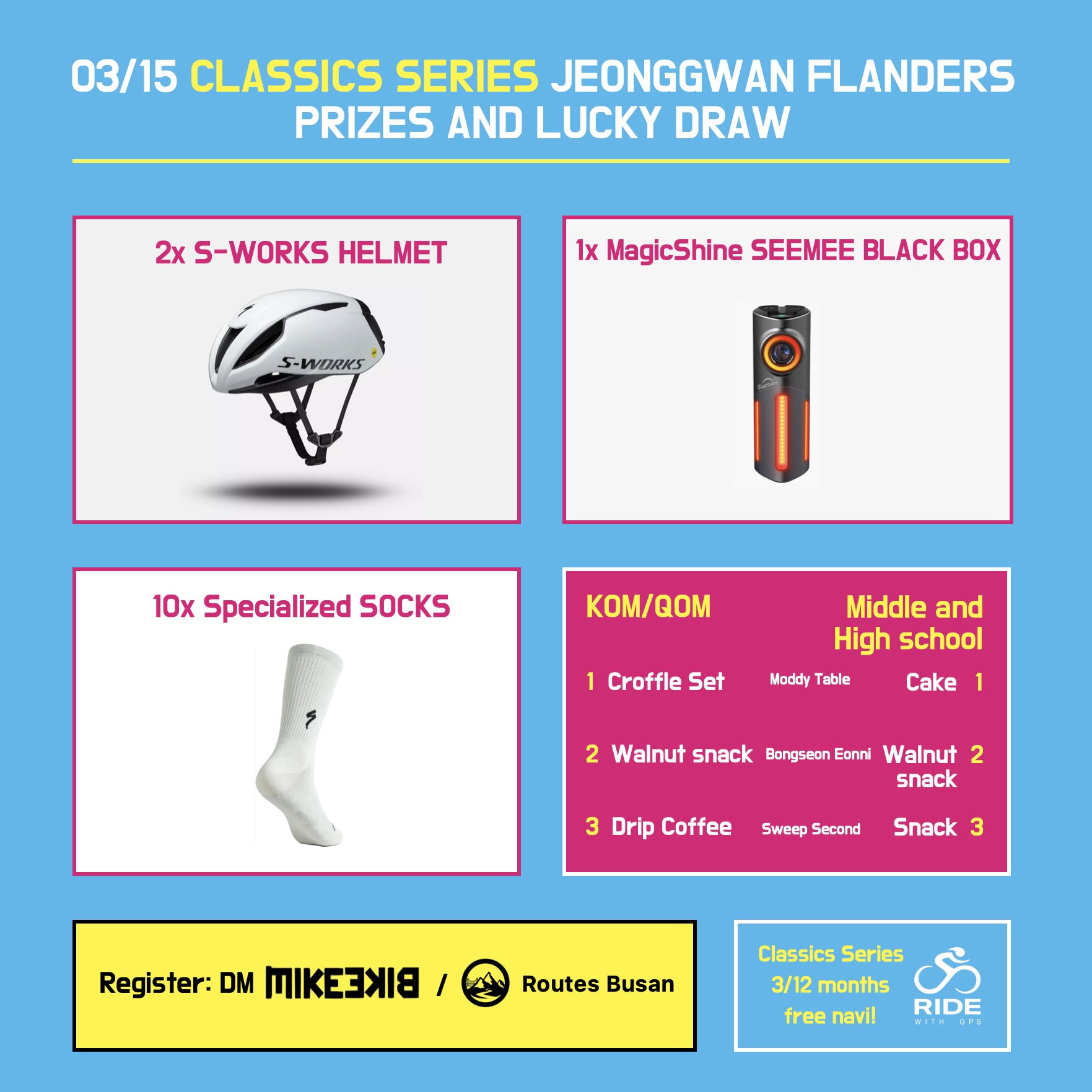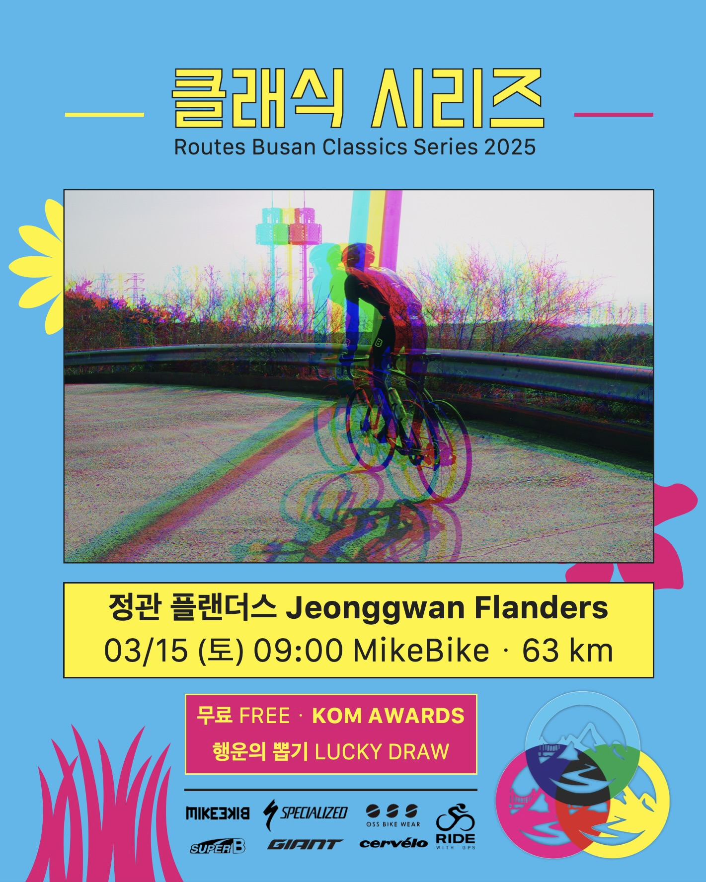 Good times at cool bike shops, great courses and professional photography: the Routes Busan Classics Series is back in 2025! We traditionally kick off with the iconic Flanders course, starting from MikeBike in Jeonggwan. The course features many short hills on concrete and farm roads, just like the Tour of Flanders in Belgium. Riders can enjoy this course at their own pace. Registration is free, but necessary – every rider is obliged to sign a waiver to start. If a participant is under 18, a parent must sign.
