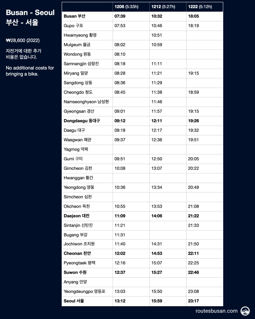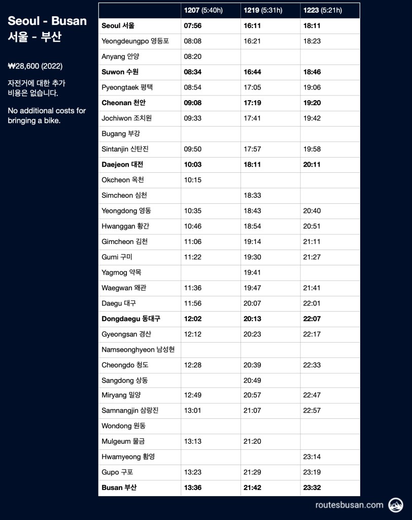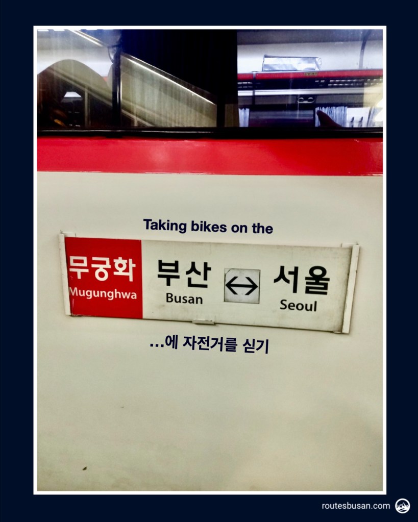 There are several trains across the country that have a designated space for bikes, but the service often inconsistent. Recently (2022) Korail reintroduced bike racks in 6 Mugungwha trains between Busan and Seoul every day, with some great destinations on the way.