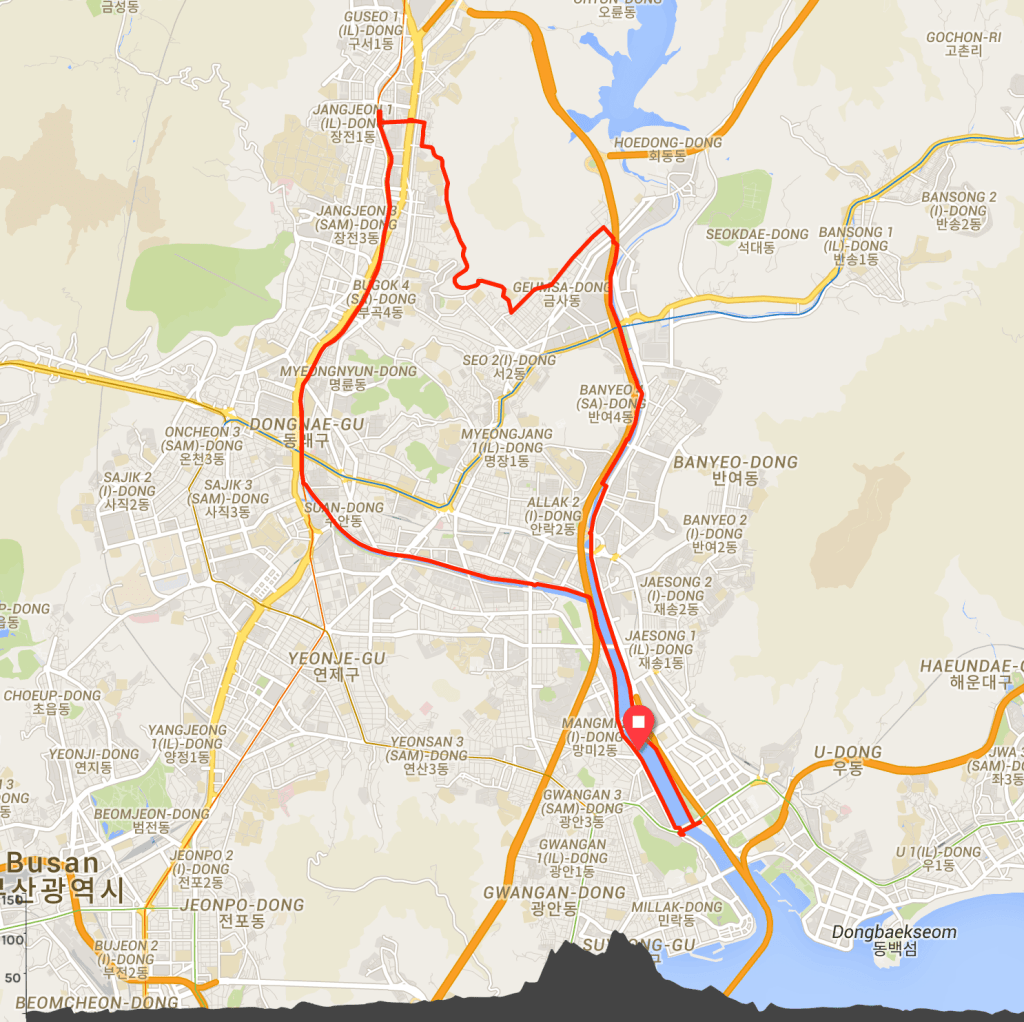 One of the shorter rides in the city. The route, 100 meters above sea level, takes you around Yunsan mountain, passes three temples, and connects to the bike paths of the Oncheon River and the Suyeong River. It offers a view above the buildings in the Dongnae area. Getting to this road is a bit of a climb, but after you’re over the top it launches you down and up the hill like a falcon in flight.