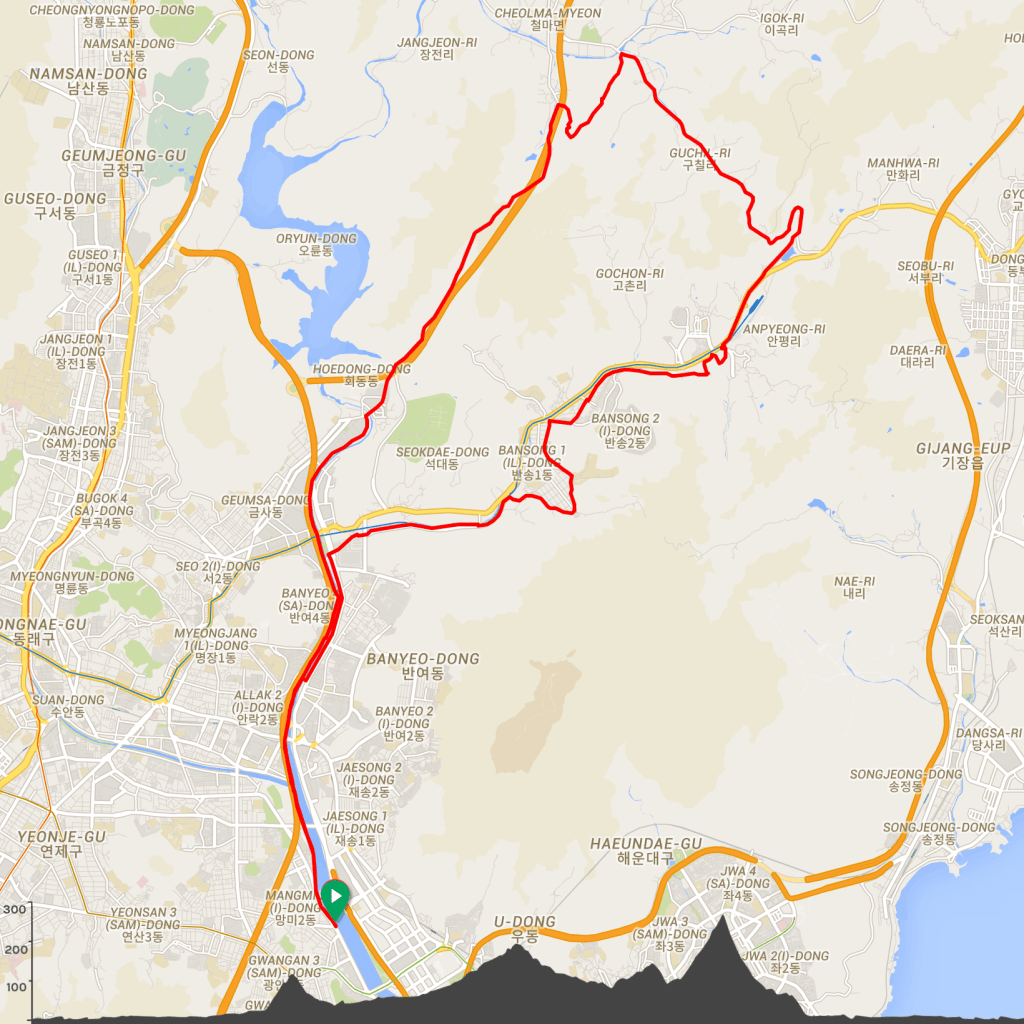 개좌 철마 루프 32.7 km ● 520 m 시작/도착수영강 RideWithGPS지도 장치로 보내기 StravaKomoot 다운로드GPX | TCX | FIT 안평에서 기장까지의 혼잡한 도로를 우회해서 가는 루트입니다. 상대적으로 조용한 곳을 통해 달리며 클라이밍을 조금 하게 될 겁니다. 안평의 작은 길들을 지나치면 철마 쪽의 쉬운 업힐 중 하나를 오르게 될거에요. 다운힐 마지막 쪽에서는 조금 주의를 기울여주세요. 왼쪽으로 농삿길을 지나 2km 정도 시멘트 길을 달리게 될 것이고 이후에는 Big Bastard의 뒷부분을 오르게 될겁니다.